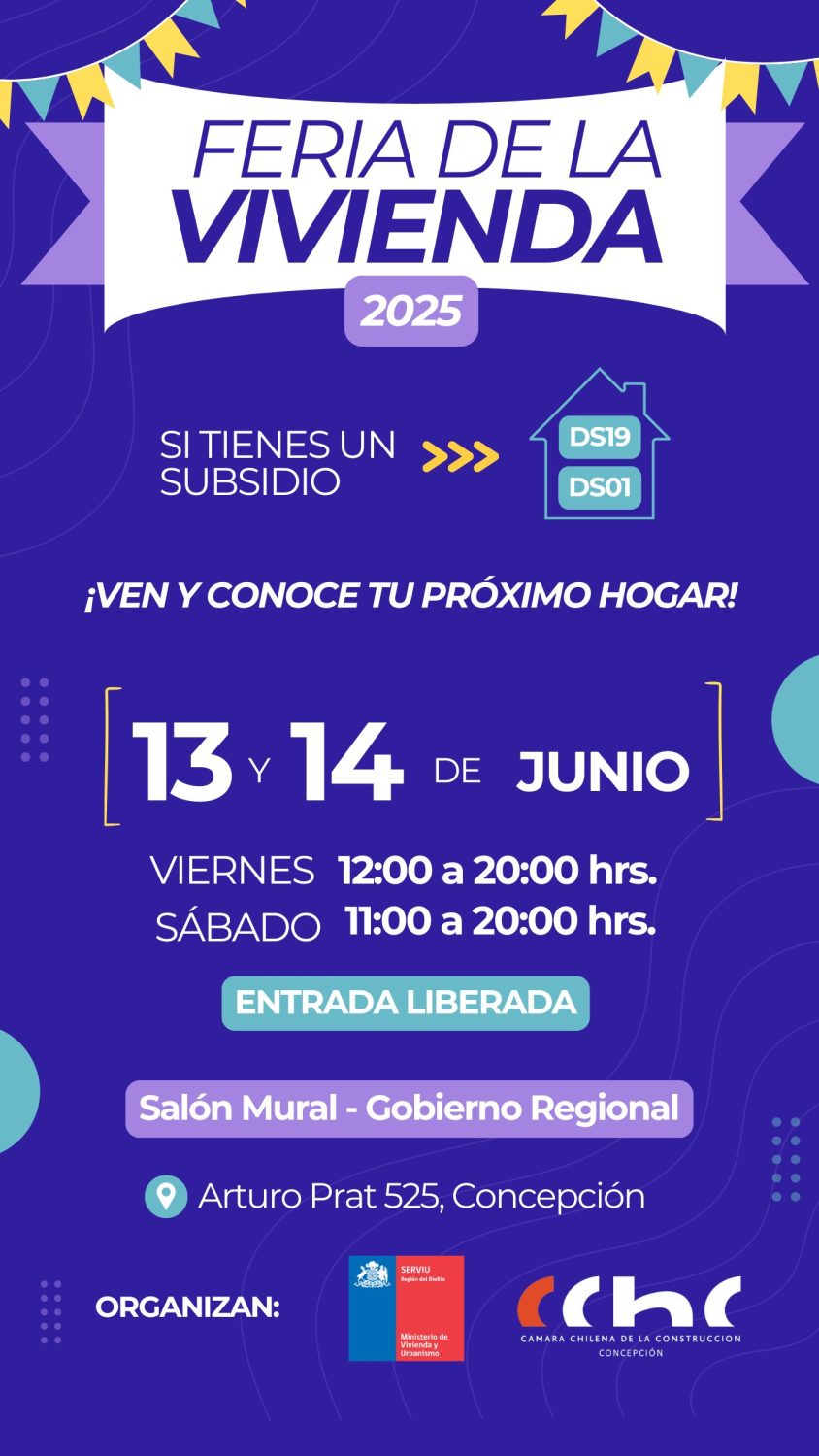 Este 13 y 14 de junio, el Salón Mural del Gobierno Regional del Biobío (Arturo Prat 525, Concepción) será el punto de encuentro de la Feria de la Vivienda 2025. Esta feria es una oportunidad crucial para quienes buscan concretar el sueño de su primer hogar, especialmente si cuentan con subsidios habitacionales como el DS19 o el DS01.
