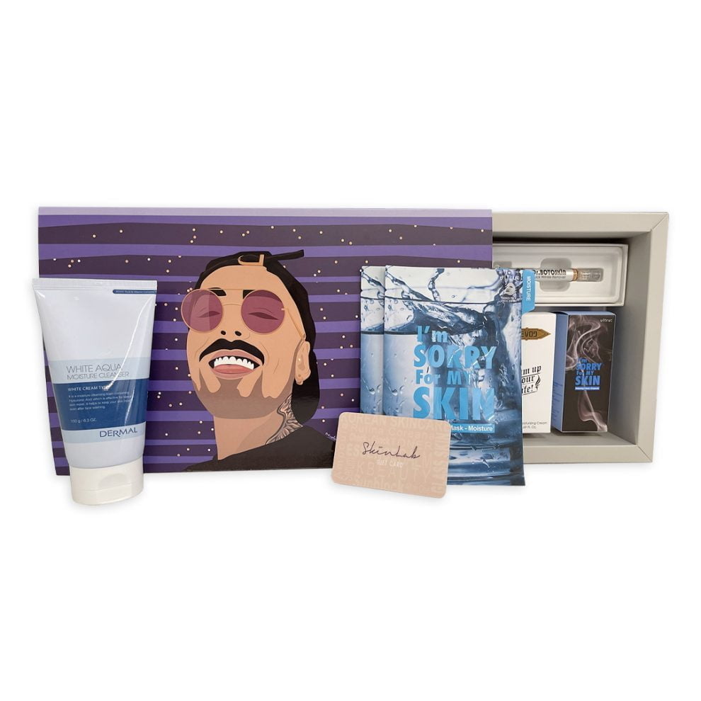La caja está compuesta por: dos mascarillas faciales con esencia en gel, fabricadas a base de fibras de eucalipto y biodegradables; una ampolla y crema para una hidratación de 72 horas, que ayuda a mejorar la elasticidad de manera intensiva; una crema que logra un efecto bótox sin inyecciones; una crema DEVO9, marca vegana cruelty free hidratante que deja la piel suave y tersa ayudando a mejorar el tono, la hidratación y la elasticidad cutánea; y una espuma Dermal limpiadora White Aqua Moisture, que contiene ácido hialurónico, eficaz para mantener la humectación.