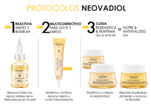Para Camila Moreno, encargada de comunicación científica de Vichy “durante todo este tiempo, los estrógenos fluctúan y el cortisol aumenta, lo que agrava los signos visibles del envejecimiento de la piel. Por eso, en el núcleo de Neovadiol se encuentra este dúo reafirmante de Proxylane y Extracto de Cassia que ha demostrado multiplicar por 10 la síntesis de fibras cutáneas reafirmantes”.