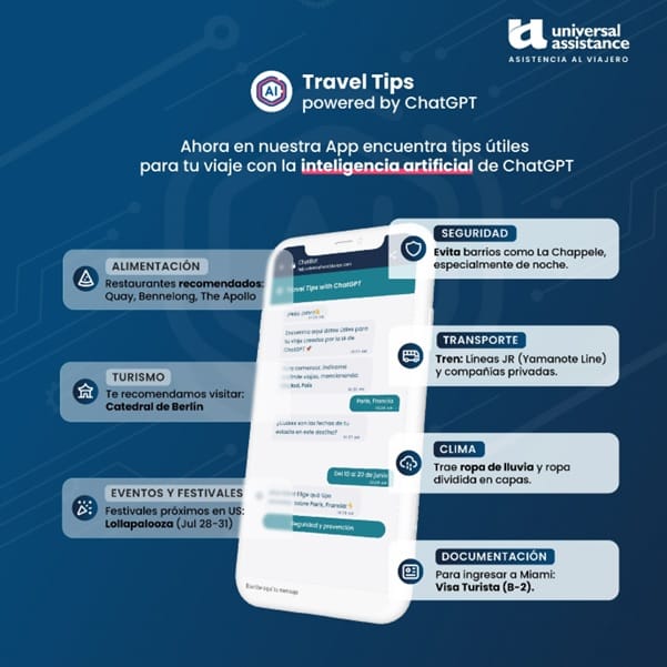 Universal Assistance, la empresa líder en asistencia al viajero se complace en anunciar su última innovación en tecnología, la incorporación del servicio Travel Tips with ChatGPT en su aplicación mobile. Esta iniciativa pionera permitirá a los usuarios acceder a información útil y preventiva sobre sus destinos de manera rápida y sencilla, brindando una experiencia de viaje aún más enriquecedora y segura.